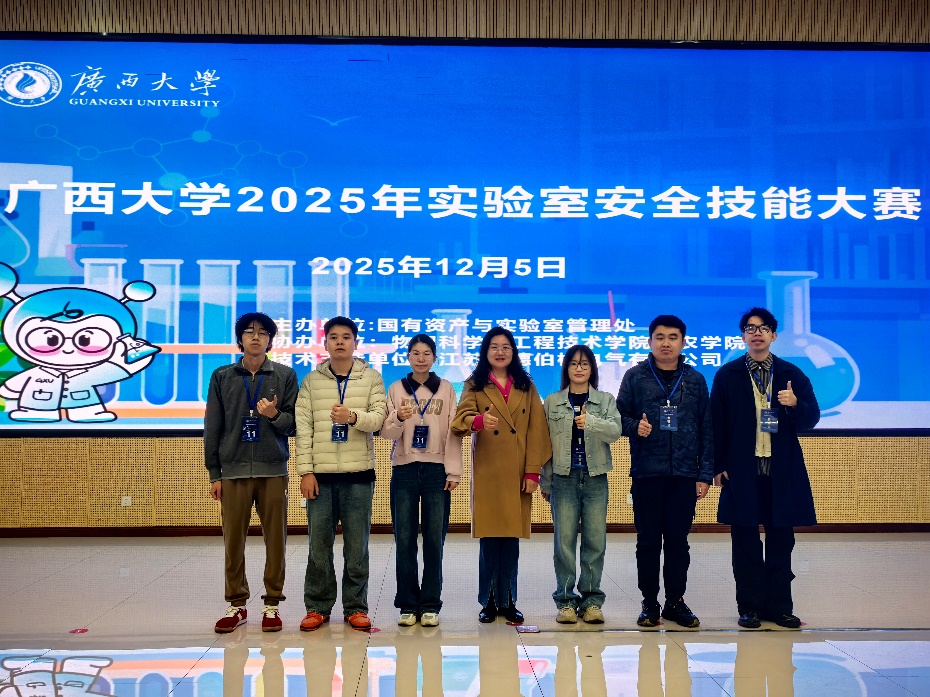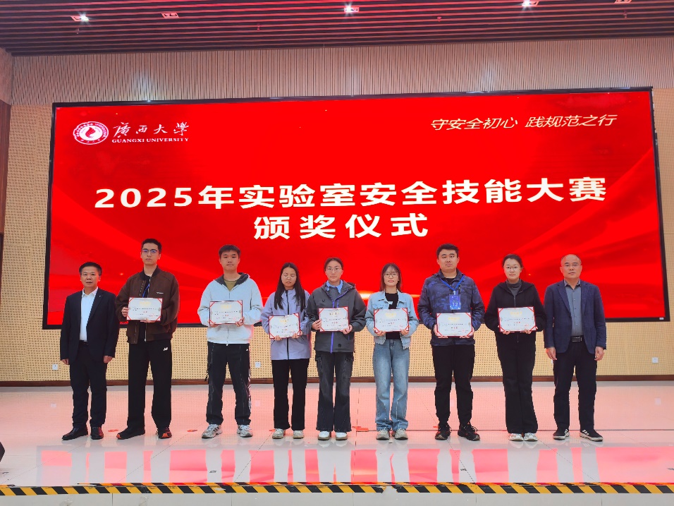 12月5日,广西大学2025年实验室安全技能大赛圆满落幕。本次大赛以“守安全初心,践规范之行”为主题,是学校实验室安全文化月的重要活动,全校共27支队伍参赛。我院选拔的本科生、研究生两支队伍表现亮眼,分别斩获涉化赛道一等奖(第一名)和三等奖。
