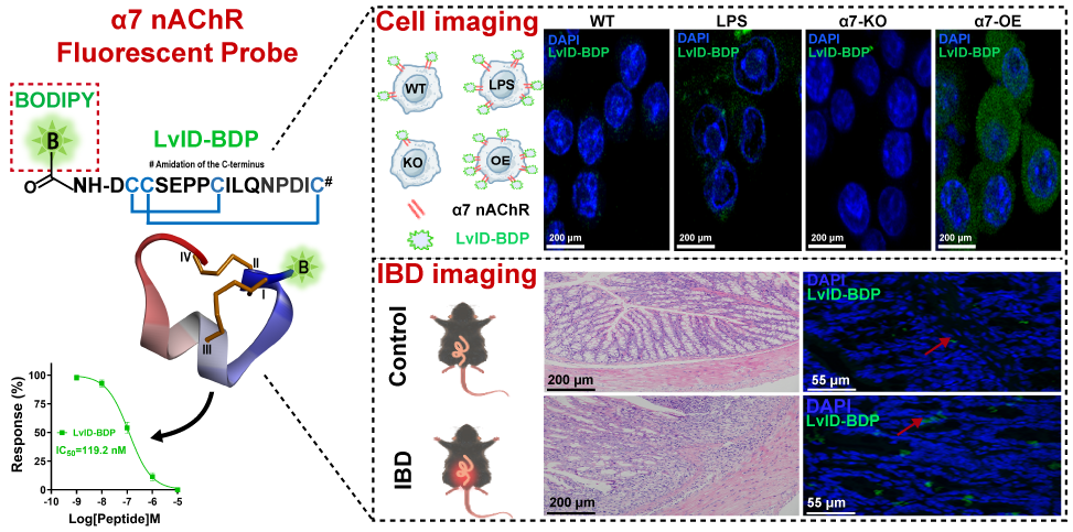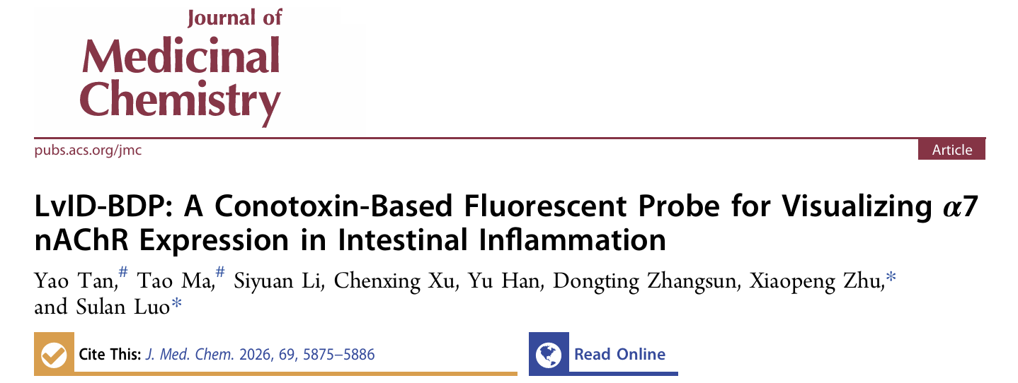 近日,广西大学医学院罗素兰教授团队在国际权威药物化学期刊《Journal of Medicinal Chemistry》上发表了一篇题为“LvID-BDP: A Conotoxin-Based Fluorescent Probe for Visualizing α7 nAChR Expression in Intestinal Inflammation”的研究论文。该研究基于前期发现的芋螺多肽LvID,构建了一种新型荧光探针LvID-BDP,可用于检测肠道炎症中α7烟碱型乙酰胆碱受体(α7 nAChR)的表达动态变化,为α7 nAChR的组织分布和功能研究提供了重要工具。