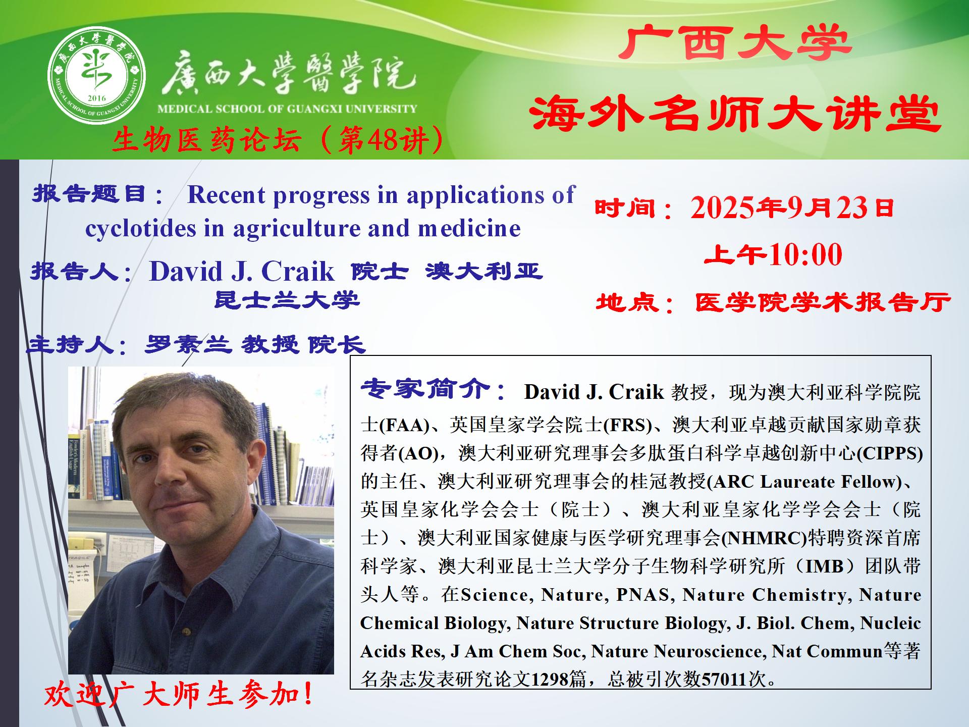 广西大学医学院生物医药论坛(第48讲):Recent progress in applications of cyclotides in agriculture and medicine