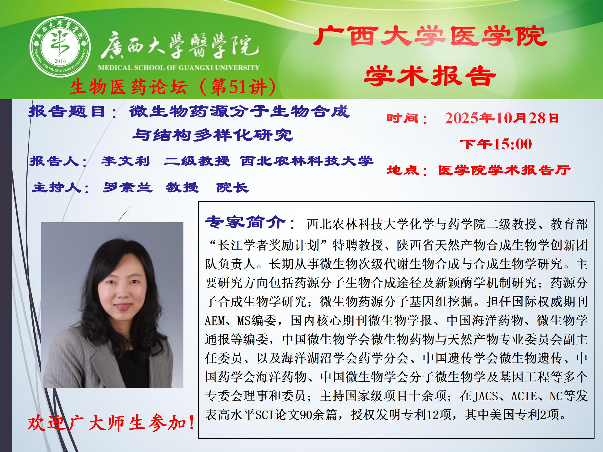 广西大学医学院生物医药论坛(第51讲):微生物药源分子生物合成与结构多样化研究
