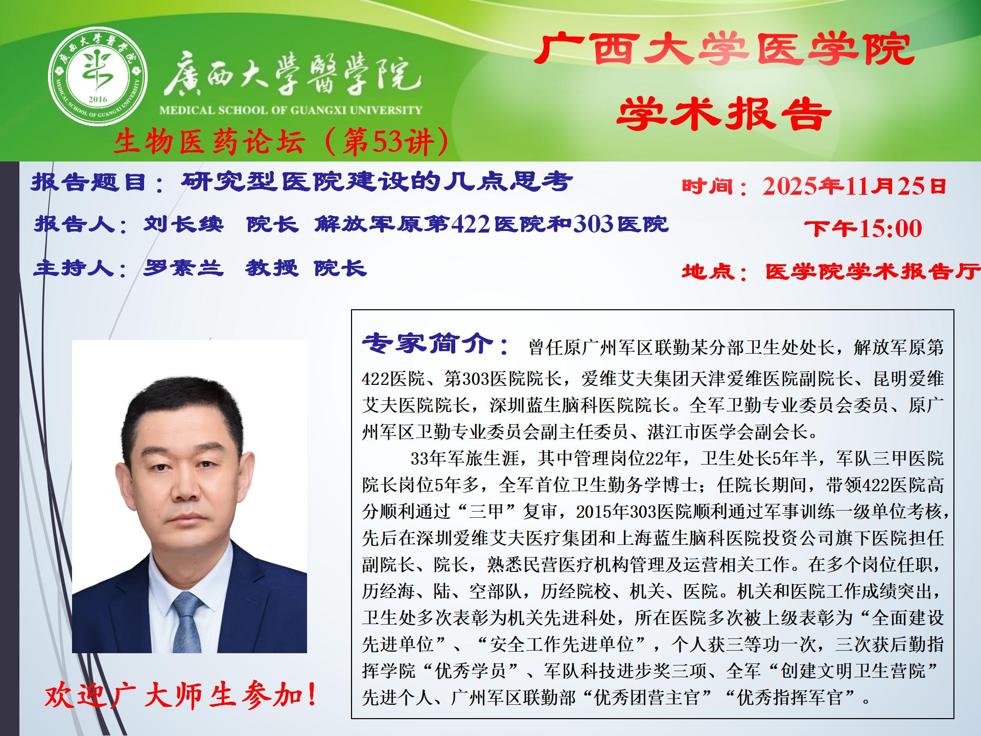 广西大学医学院生物医药论坛(第53讲):研究型医院建设的几点思考